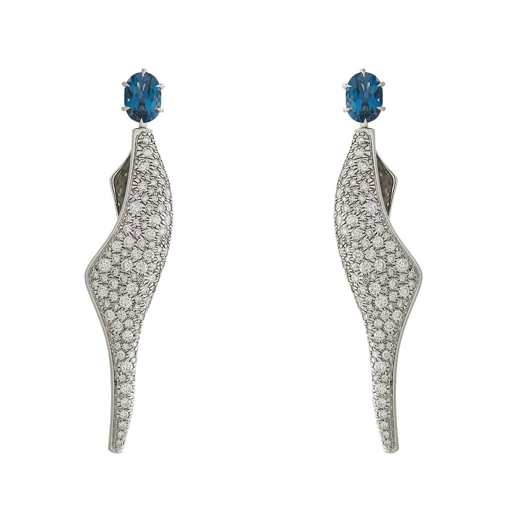 Brincos de ouro branco 18K com topázios azuis london e diamantes - Longo - Coleção Mar de Voltas